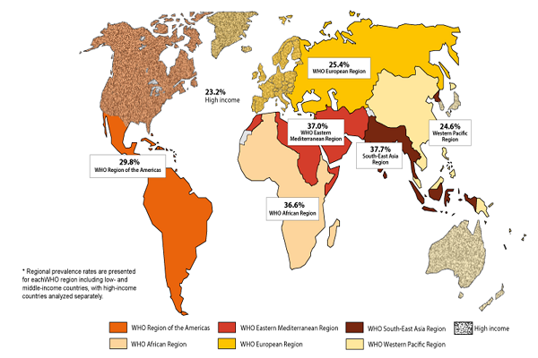 Prevalence rate of intimate partner violence by WHO region in 2010.