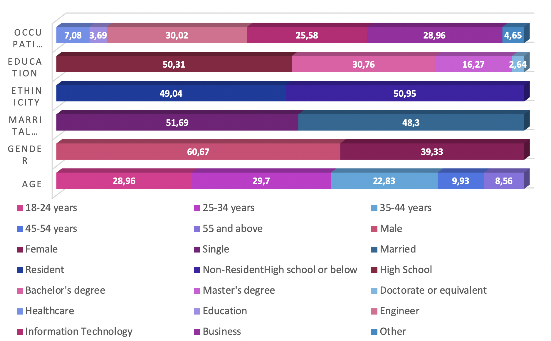 The participants represented various provinces, with East has the highest frequency (255, 26.9 %), followed by North (176, 18.6 %); these comparisons are illustrated in Figure 1. The age distribution indicated a diverse population, with significant representation across different age groups. Regarding gender, the majority were men (574, 60.67 %), and the study reflected a nearly equal split in marital status, with slightly more single participants (489, 51.69 %). The study encompassed both residents (464, 49.04 %) and non-residents (482, 50.95 %) as well as individuals with diverse educational backgrounds and occupations. Relative frequencies are displayed in Figure 2.