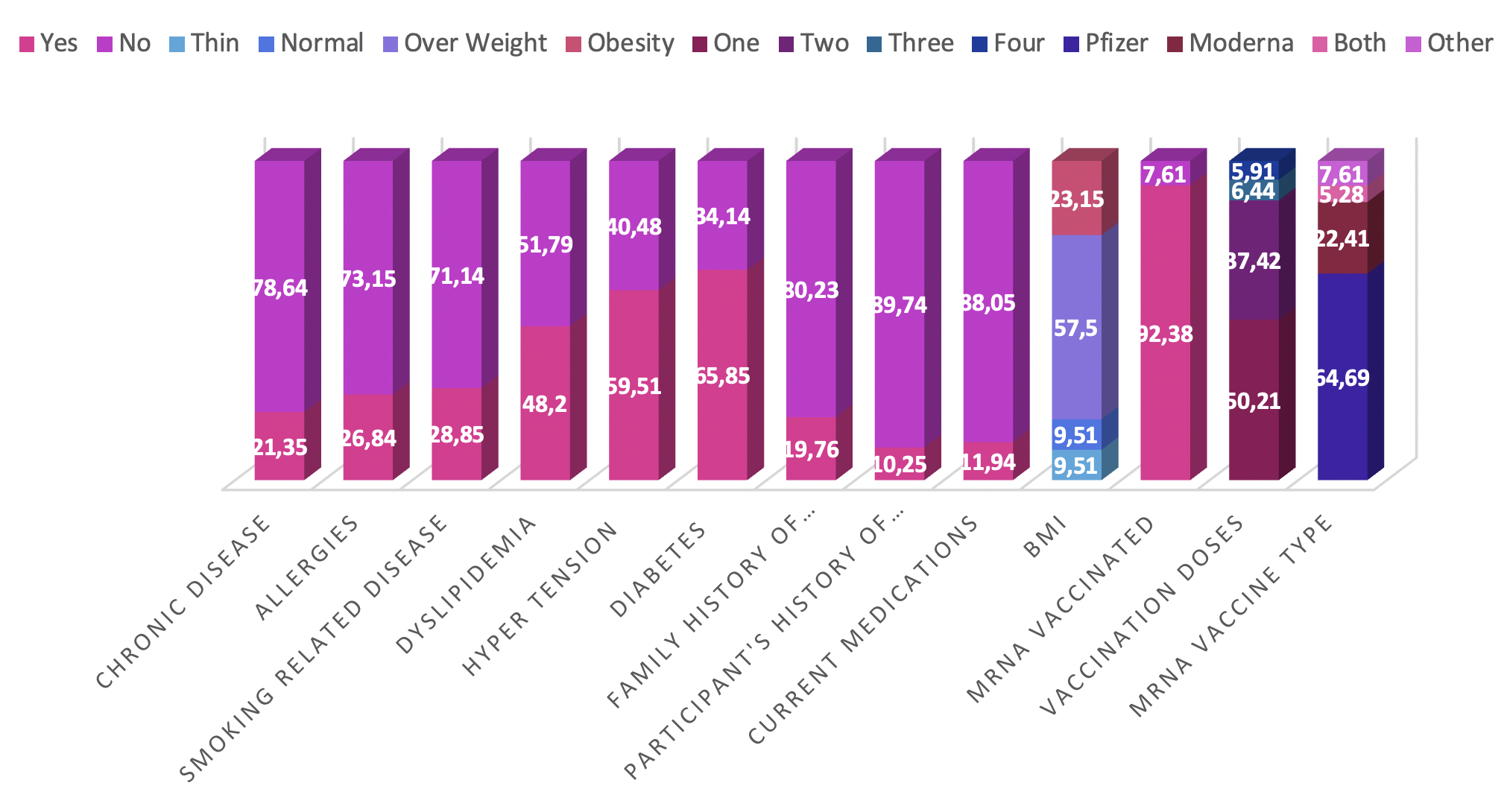A high proportion of participants reported having received an mRNA vaccine (874, 92.38 %), with Pfizer-BioNTech being the predominant formulation (612, 64.69 %). Most respondents had completed a two-dose regimen (354, 37.42 %). The study additionally collected comprehensive medical history data, including body-mass index, chronic conditions, allergies, and other relevant health issues. Comparative frequency distributions are presented in Figure 3.