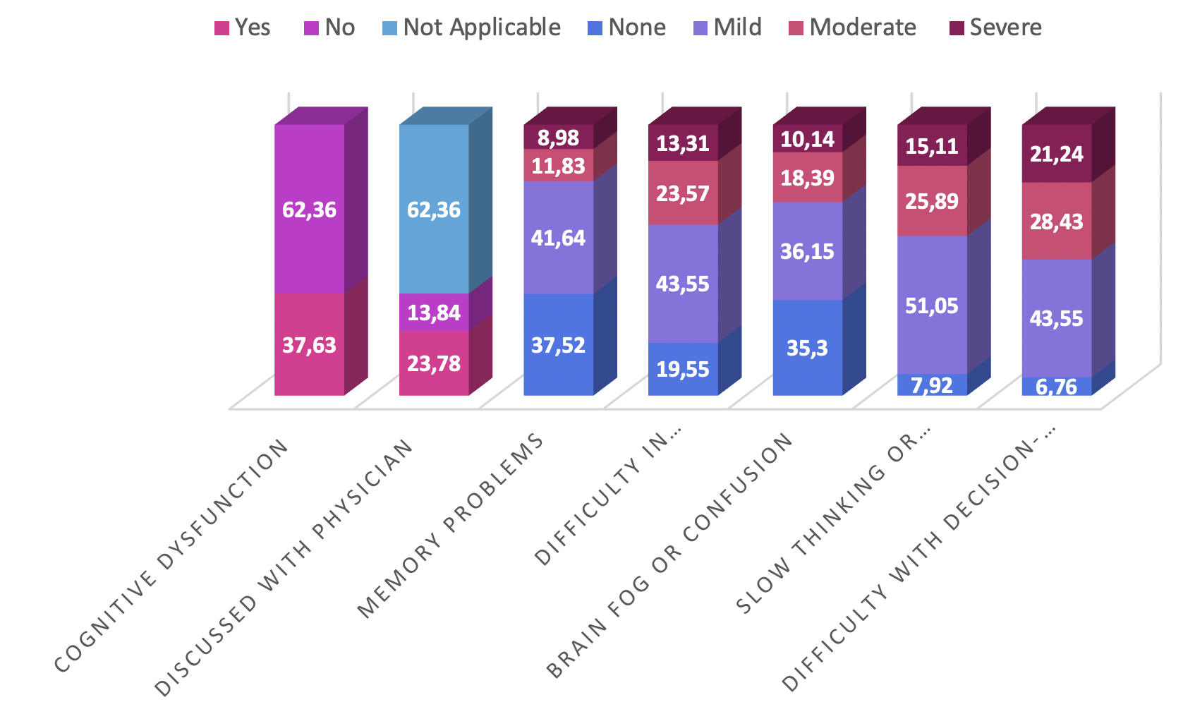 Participants were asked to rate the severity of their cognitive dysfunction on a 10-point Likert scale (1 = minimal; 10 = maximal). Responses were broadly distributed, although most ratings clustered within the mid-range (4–6). Specifically, 314 participants (33.19 %) selected a score of 5, reflecting a moderate degree of impairment.
