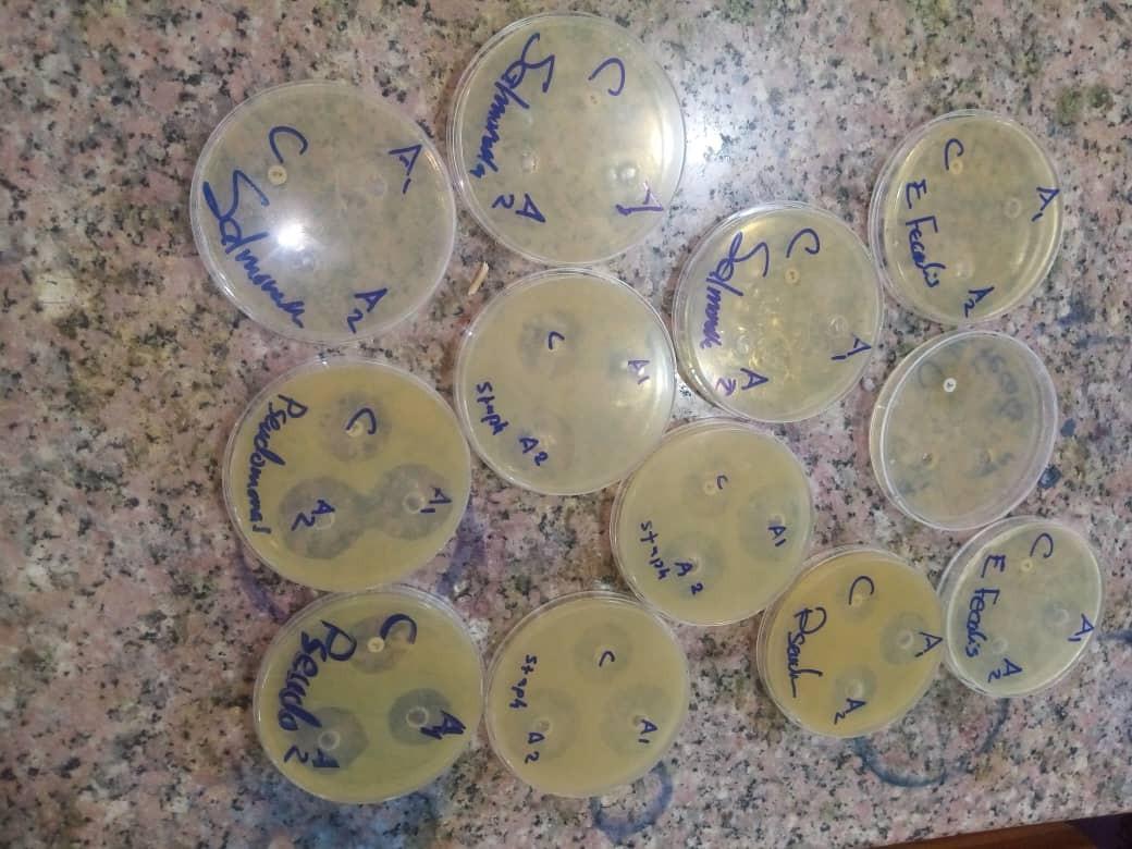 Aqueous garlic extract was evaluated against standard strains of Escherichia coli, Staphylococcus aureus, Salmonella Typhi, Pseudomonas aeruginosa, and Enterococcus faecalis using the well-diffusion assay. Two concentrations of the extract were tested (A1, 1 g/mL, and A2, 0.5 g/mL), with ciprofloxacin serving as the positive control. The diameters of the zones of inhibition obtained with the different concentrations of garlic extract were as follows: