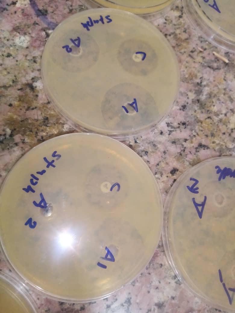 Colonies of bacteria were suspended in sterile normal saline (0.9 %) and adjusted to approximately 10 colony-forming units (CFU) according to the McFarland standard. Mueller–Hinton agar was cooled to 45 °C; 25 mL of medium was dispensed into each 90-mm Petri dish, after which 200 µL of the bacterial suspension was gently mixed into the molten agar. Once the agar had completely solidified, three circular wells (10 mm in diameter) were cut into the medium with a sterile test tube, and the agar plugs were removed. Using an adjustable pipette, two wells were filled with 100 µL of Allium sativum extract (AGE) at 1 g/mL and 500 mg/mL, respectively, whereas the third well received the control antibiotic. The plates were kept at room temperature for 40 min and then incubated upright overnight at 37 °C 10.