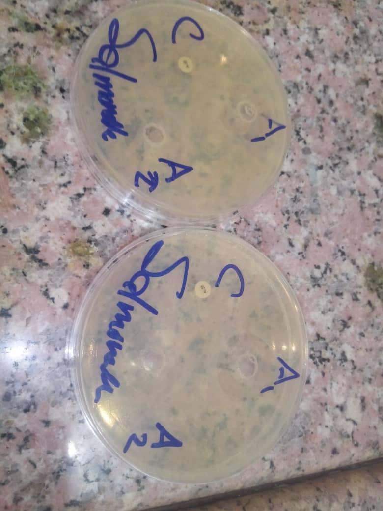 Zone of inhibition of A1 (concentration of garlic extract 1g/ml), A2 (concentration of garlic extract 500mg/ml) and C (control: (ciprofloxacin) against salmomalla typhi.