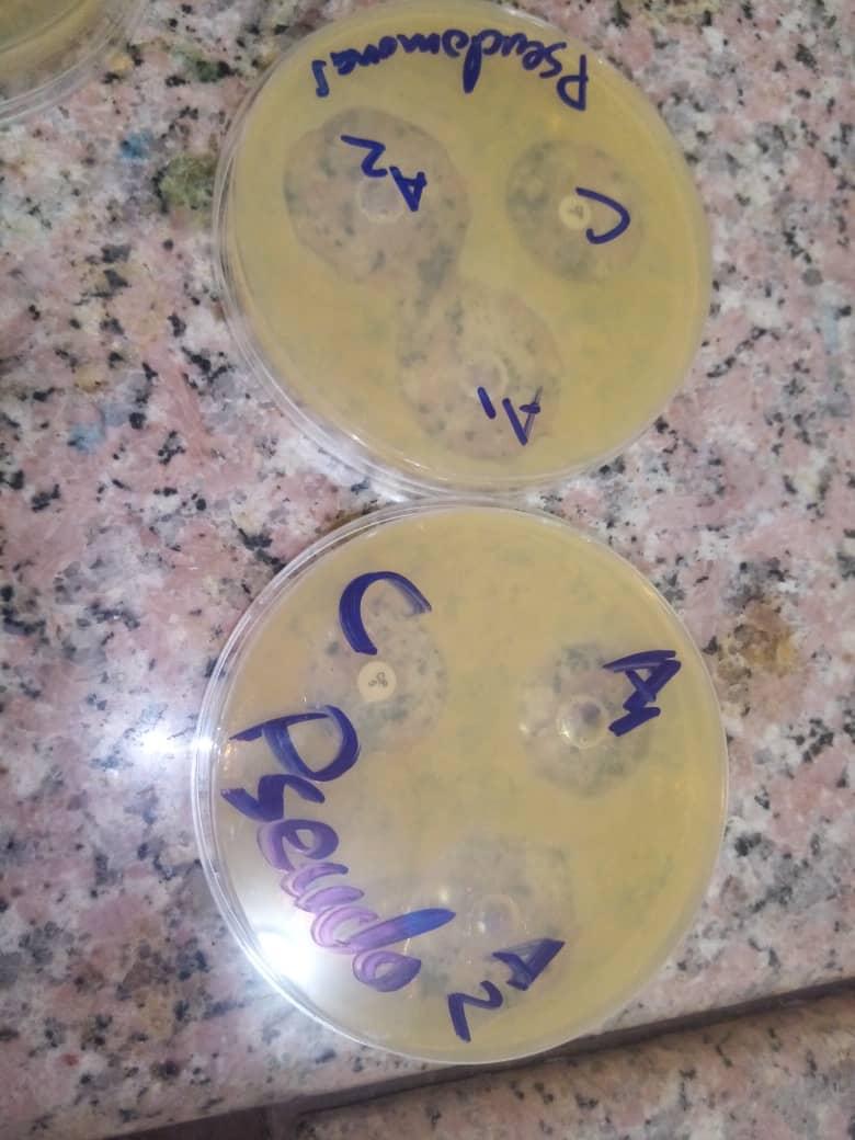 Zone of inhibition of A1 (concentration 1g/ml), A2 (concentration 500mg/ml) and C (control: (ciprofloxacin) against Ps.aeruginosa.